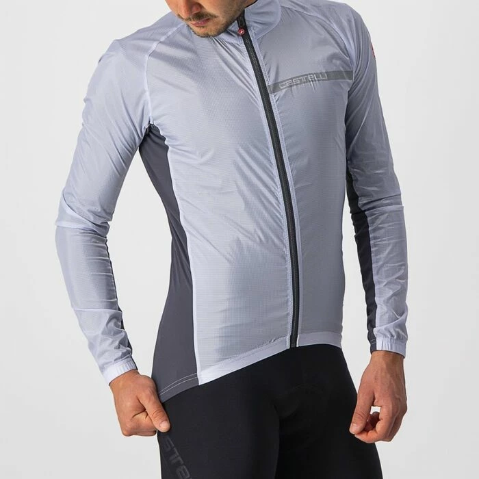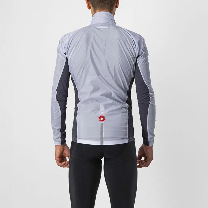 Il s’agit d’une version moderne de la veste shell coupe-vent, celle que vous gardez dans votre poche pour les longues descentes ou que vous enfilez pendant la première heure jusqu’à ce que la température se réchauffe. Cette veste était autrefois très simple : c’était un shell en nylon qui manquait d’élasticité et devait donc être coupé pour s’adapter à toutes les morphologies, à la fois sur et hors du vélo. Castelli à complètement repensé la veste shell et comment elle est construite. Ils ont ajouté des panneaux sur les côtés et les manches en tissu très extensible avec mailles serrées, ce qui permet de lui donner une coupe moderne près du corps pour gagner au niveau aérodynamique sur tous les terrains. Elle garde aussi davantage de chaleur qu’une veste qui flotte au vent et reste très compacte afin de pouvoir être rangée dans un minimum d’espace dans une poche de maillot. Ses panneaux extensibles ont reçu un traitement déperlant qui protège en cas de légers brouillards, mais attention, il ne s’agit pas d’une véritable veste de pluie.