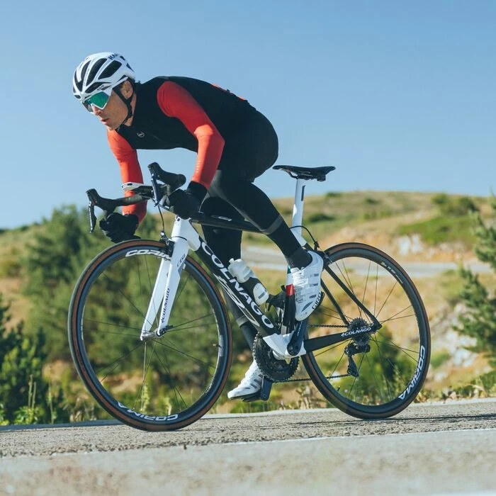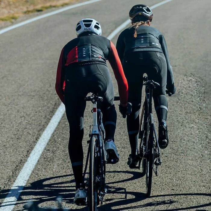 Couche extérieure serrée dont la structure favorise la position sur le vélo.